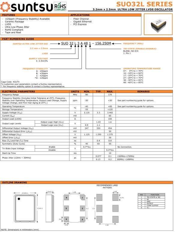 Suntsu晶振,SUO32L晶振,SUO32L3A481-80.000M晶振,小型SMD有源晶振,從最初超大體積到現在的7050mm,6035mm,5032mm,3225mm,2520mm體積,有著翻天覆地的改變,體積的變小也使產品帶來了更高的穩定性能,接縫密封石英晶體振蕩器,精度高,覆蓋頻率范圍寬的特點,SMD高速自動安裝和高溫回流焊設計,Optionable待機輸出三態輸出功能,電源電壓范圍:1.8V~5V,高穩定性,低抖動,低功耗,主要應用領域:無線通訊,高端智能手機,平板筆記本WLAN,藍牙,數碼相機,DSL和其他IT產品的晶振應用,三態功能,PC和LCDM等高端數碼領域,符合RoHS/無鉛.