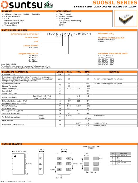 松圖晶振,SUO53L晶振,SUO53L3A481-156.250M晶振,5032mm體積的石英晶體振蕩器,有源晶振,該產品可驅動2.5V的溫補晶振,壓控晶振,VC-TCXO晶體振蕩器產品,電源電壓的低電耗型,編帶包裝方式,可對應自動高速貼片機自動焊接,及IR回流焊接(無鉛對應),為無鉛產品,超小型,質地輕.產品被廣泛應用到集成電路,程控交換系統,無線發射基站.
