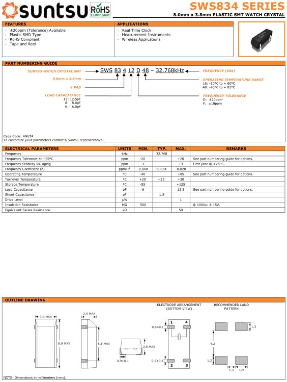 Suntsu晶振,SWS834晶振,SWS83412D48-32.768kHz晶振,32.768K時鐘晶體具有小型,薄型,輕型的貼片晶振表面音叉型晶體振蕩器,產(chǎn)品具有優(yōu)良的耐熱性,耐環(huán)境特性,可發(fā)揮晶振優(yōu)良的電氣特性,符合RoHS規(guī)定,滿足無鉛焊接的高溫回流溫度曲線要求,金屬外殼的封裝使得產(chǎn)品在封裝時能發(fā)揮比陶瓷振蕩器外殼更好的耐沖擊性.