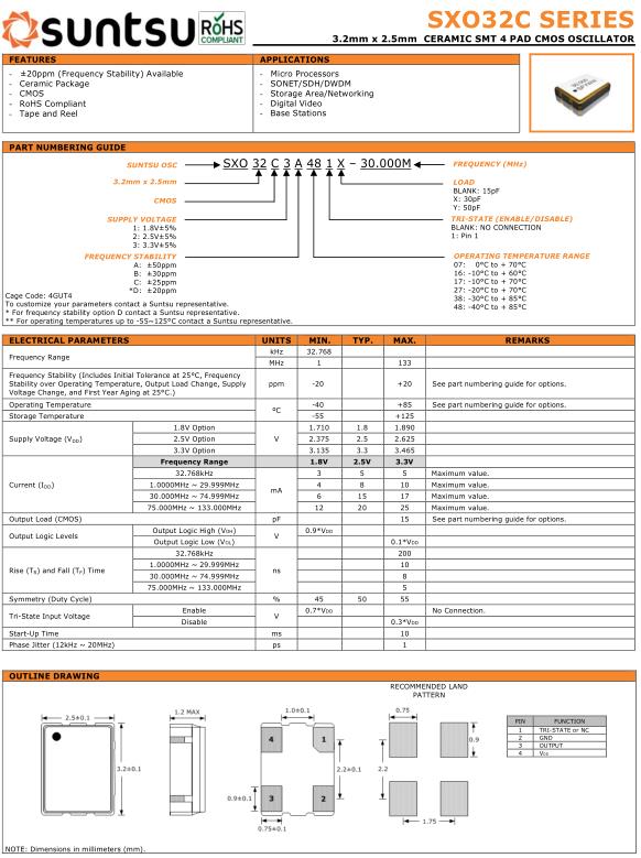 Suntsu晶振,SXO32C晶振,SXO32C3A481X-24.000M晶振,小型SMD有源晶振,從最初超大體積到現(xiàn)在的7050mm,6035mm,5032mm,3225mm,2520mm體積,有著翻天覆地的改變,體積的變小也使產(chǎn)品帶來了更高的穩(wěn)定性能,接縫密封石英晶體振蕩器,精度高,覆蓋頻率范圍寬的特點,SMD高速自動安裝和高溫回流焊設計,Optionable待機輸出三態(tài)輸出功能,電源電壓范圍:1.8V~5V,高穩(wěn)定性,低抖動,低功耗,主要應用領域:無線通訊,高端智能手機,平板筆記本W(wǎng)LAN,藍牙,數(shù)碼相機,DSL和其他IT產(chǎn)品的晶振應用,三態(tài)功能,PC和LCDM等高端數(shù)碼領域,符合RoHS/無鉛.