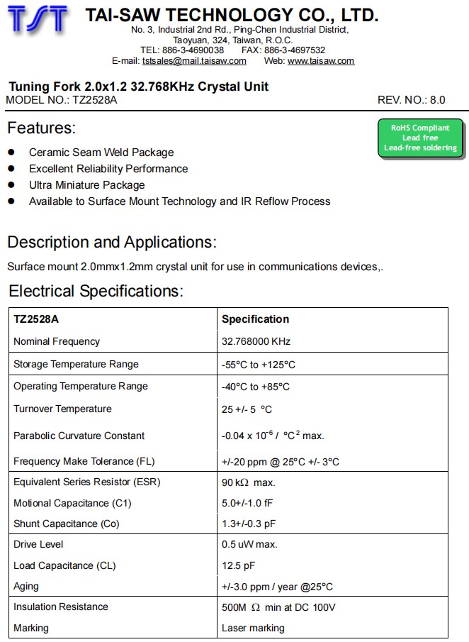 臺灣TST嘉碩晶振TZ2528A,2012兩腳貼片晶振,32.768KHz時鐘晶振,參數表