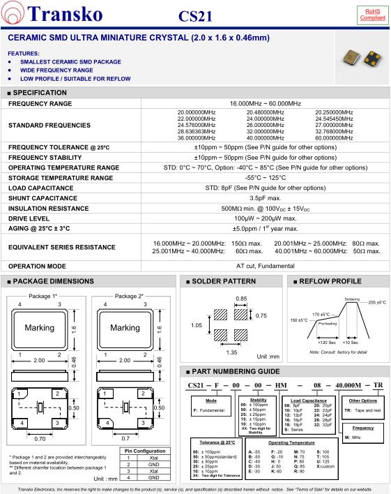 Transko晶振,CS21晶振,CS21F0000HM08-16.000-TR晶振,貼片晶振本身體積小,超薄型石英晶體振蕩器,特別適用于有目前高速發(fā)展的高端電子數(shù)碼產(chǎn)品,因為晶振本身小型化需求的市場領(lǐng)域,小型,薄型是對應陶瓷振蕩器(偏差大)和普通的石英晶體振蕩器(偏差小)的中間領(lǐng)域的一種性價比較出色的產(chǎn)品.產(chǎn)品廣泛用于筆記本電腦,無線電話,衛(wèi)星導航SSD,USB,Blu-ray等用途,符合無鉛焊接的高溫回流焊曲線特性.