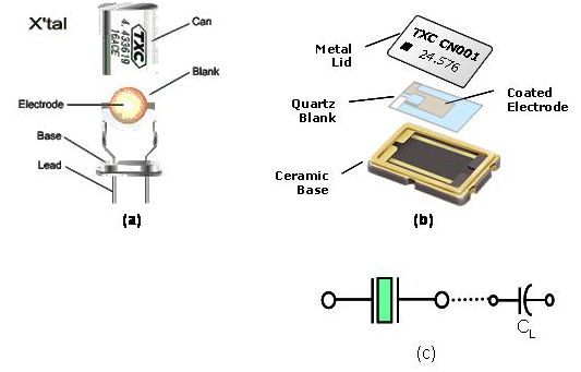 (a)及(b)分別是DIP型式及SMD型式的石英振蕩子的基本結(jié)構(gòu)圖. (如圖)(c)是電子電路上所使用代表石英振蕩子的電子符號(hào). 當(dāng)石英晶體共振子處在遠(yuǎn)離振蕩頻率區(qū)域時(shí), 石英晶體共振子僅是一個(gè)電容性的組件, 當(dāng)頻率接近石英晶體的振蕩頻率時(shí), 就接近是一個(gè)電感性的等效LCR振蕩線路.