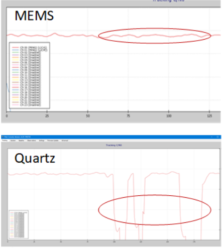 MEMS與石英相比,用于通過熱空氣流動(dòng)和振動(dòng)攻絲進(jìn)行衛(wèi)星跟蹤.石英失去了幾次跟蹤;MEMS保持穩(wěn)定.