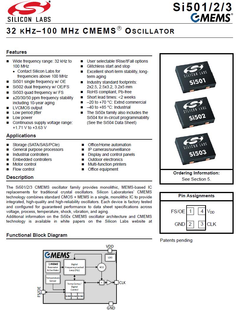編碼501BCAM032768DAG,型號Si501,頻率為32.768KHZ,Si501/2/3CMEMS振蕩器系列提供基于mems的單片集成電路取代傳統(tǒng)晶體振蕩器。硅實(shí)驗(yàn)室的CMEMS技術(shù)結(jié)合了標(biāo)準(zhǔn)的CMOS+MEMS在一個(gè)單一的,單片IC提供集成,高品質(zhì)和高可靠性的SMD振蕩器。每個(gè)設(shè)備都經(jīng)過工廠測試并配置為保證性能的數(shù)據(jù)表規(guī)范跨越電壓、工藝、溫度、沖擊、振動(dòng)和老化。