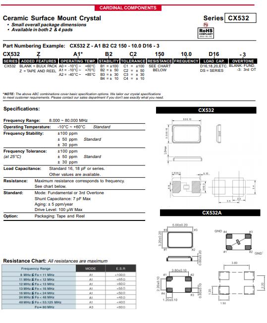 | CX532Z-A2B3C5-70-12.288D18 | Cardinal晶振 | CRYSTAL 12.2880MHZ 18PF SMD | CX532 | MHz Crystal | 12.288MHz | ±30ppm | 70 Ohm | -40°C ~ 85°C |