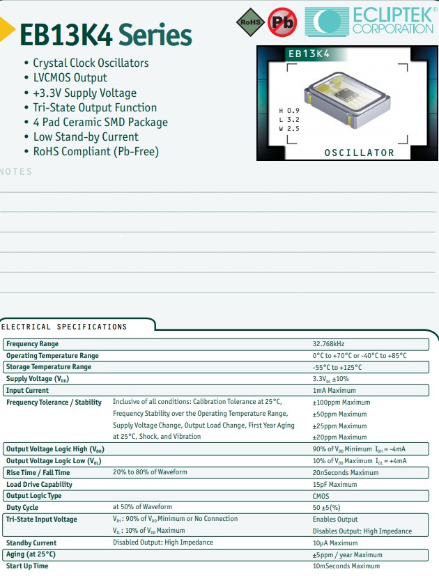 | EB13K4G2H-32.768K | CMOS | 3.3Vdc | SMD 2.5mm x 3.2mm | ±100ppm | -40°C to +85°C | 50 ±5(%) | ±5ppm |