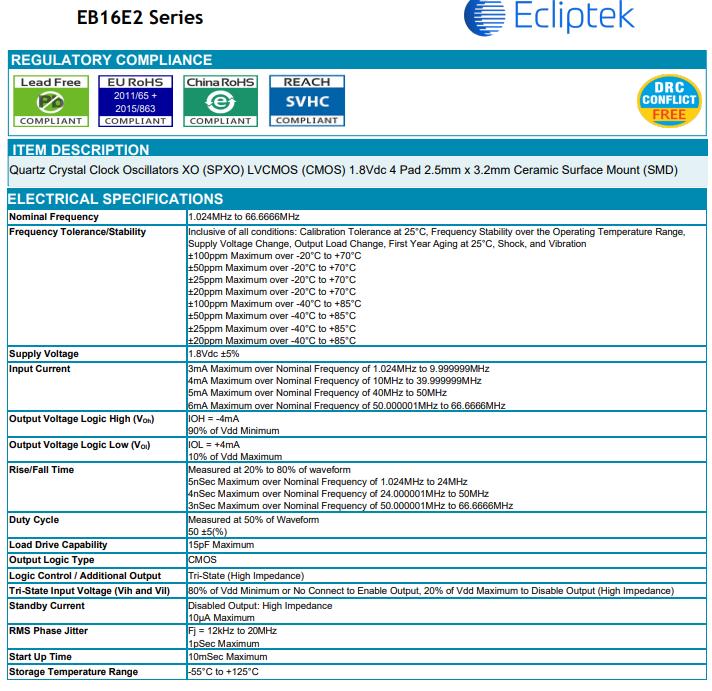 | EB16K4G2H-32.768K | Ecliptek有源振蕩器 | CMOS | 1.8Vdc | SMD 2.5mm x 3.2mm | ±100ppm | -40°C to +85°C |