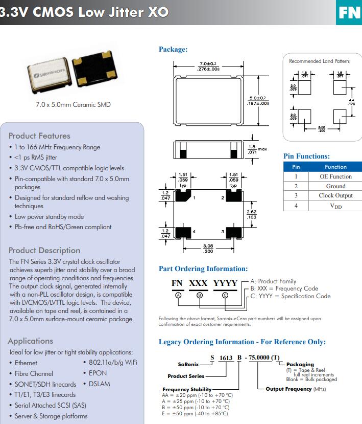 FN系列3.3V晶體時鐘振蕩器實現卓越的抖動和穩定的廣泛操作條件和頻率的范圍。內部產生的輸出時鐘信號與非鎖相環振蕩器設計,是兼容的LVCMOS/LVTTL邏輯電平。的設備,可在磁帶和卷軸上,是包含在一個7.0 x 5.0mm表面貼裝陶瓷封裝。應用程序