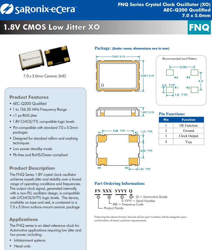 應用:FNQ系列是需要低抖動和低功耗的汽車應用的理想參考時鐘,包括:信息娛樂系統,主機