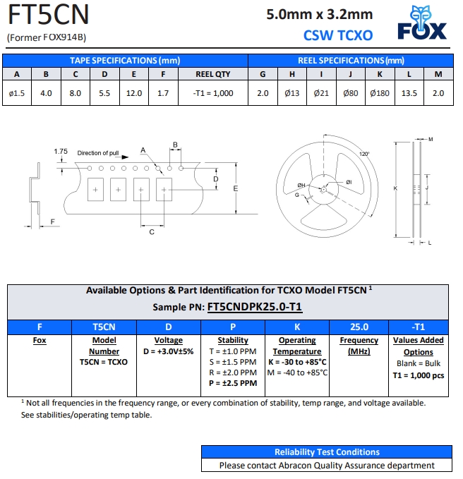 | FOX914B-19.200 | Fox振蕩器 | FOX914 | TCXO | 19.2MHz | 3V |