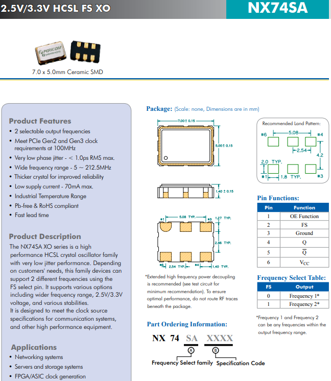 NX74SA XO系列是具有極低抖動性能的高性能HCSL晶體振蕩器系列。小體積晶振尺寸7.0mmx5.0mm,HCSL 2頻可編程XO,根據客戶的需求,該系列器件可以使用FS 選擇引腳支持2個不同的頻率。它支持多種選擇,包括更寬的頻率范圍、2.5V/3.3V電壓和各種穩定性。它旨在滿足通信系統和其他高性能設備的時鐘源規范。