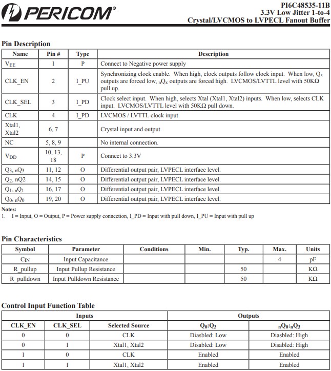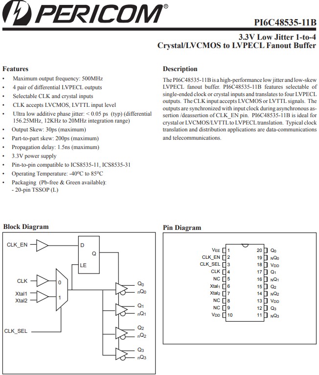 PI6C48535-11B 緩沖 4 LVPECL 500 0.05 3.3晶振LVTTL LVCMOS 30 -40 至 85 TSSOP (L20) MSL1 錫 低抖動 1 到 4 晶振/LVCMOS 到 LVPECL時鐘緩沖器