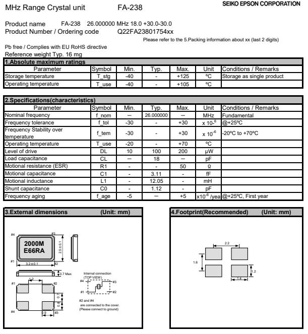 | Q22FA2380175400 | 3.2 x 2.5 x 0.7mm | FA-238 | 26.000000 MHz | 18 pF | +/-30 ppm | +/-30 ppm | -20 to +70 °C |