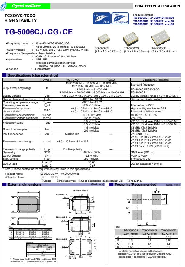 | X1G004131003816 | TG-5006CJ | 26.000000 MHz | 2.00 x 1.60 x 0.73 mm | 1.700 to 1.900 V | +/-2.0 ppm | -30 to +85 °C | +/-1.50 ppm |