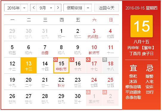 大家好!感謝大家長期以來的辛勤勞作,根據(jù)《國務(wù)院辦公廳關(guān)于2016年部分節(jié)假日安排的通知》,結(jié)合公司實際情況,中秋節(jié)假期時間為9月15日至9月17日,共3天..18日(星期天)正常上班.