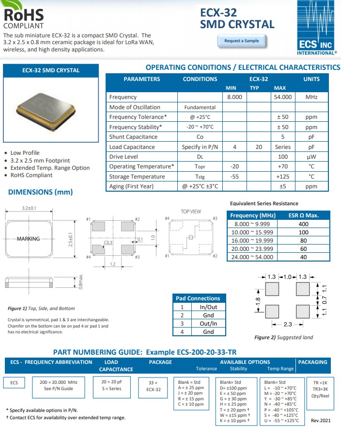 ECS伊西斯ECX-32晶振,ECS-184-20-33-CKM-TR無源晶振,ECS-130-20-33-CKM-TR,3225mm晶振,,ECS伊西斯晶振,美國進口晶振,ECX-32是一款小體積晶振,外形尺寸3.2x2.5x0.8mm晶振,陶瓷封裝四腳貼片晶振,無源晶振,石英晶體諧振器,石英晶振,無鉛環保晶振,微型ECX-32貼片晶振是一種緊湊的SMD晶體,具有超小型,輕薄型,耐熱及耐環境特點,應用:是理想的LoRa廣域網,無線網絡晶振,藍牙模塊晶振,汽車電子晶振,數碼電子晶振,安防設備,和高密度的應用。