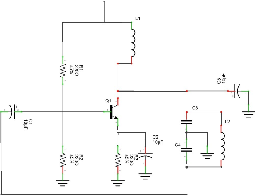 以下電路圖顯示了常見的Colpitts基本電路.電感器L和電容器C1和C2都與并聯諧振回路電路串聯,它給出振蕩器的頻率.C2端子上的電壓施加到晶體管的基極-發射極結,以產生反饋振蕩.