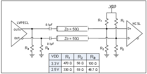 典型的HCSL接口使用電流模式驅(qū)動(dòng)器,在源端使用50Ω至GND端接,在接收器端不使用端接.此外,對(duì)于HCSL輸出驅(qū)動(dòng)器,LVPECL差分晶振驅(qū)動(dòng)器可用于驅(qū)動(dòng)HCSL輸入.圖3顯示了驅(qū)動(dòng)帶LVPECL輸出的HCSL接收機(jī)的推薦端接原理圖.為了滿(mǎn)足HCSL接收機(jī)要求的750毫伏的VOH電平和0V的VOL電平,它采用交流耦合電容來(lái)分離源和負(fù)載偏置電壓.