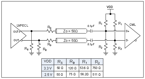 圖6:LVPECL驅(qū)動(dòng)器與帶內(nèi)部端接和偏置的自偏置差分接收器的連接.