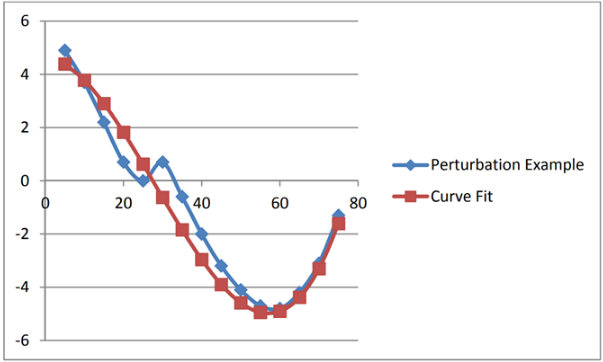 擾動 該圖中的測量數據標記為藍色.紅線是嘗試將三階多項式擬合到數據.對于沒有擾動的晶體,多項式和測量數據之間的匹配應該優于所有點的0.5ppm.三階多項式通常足以用于AT切割晶體.