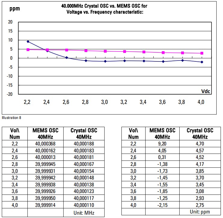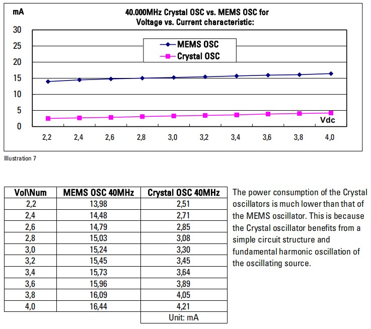 40MHz晶體振蕩器和40MHz MEMS振蕩器的功耗如下圖7所示。