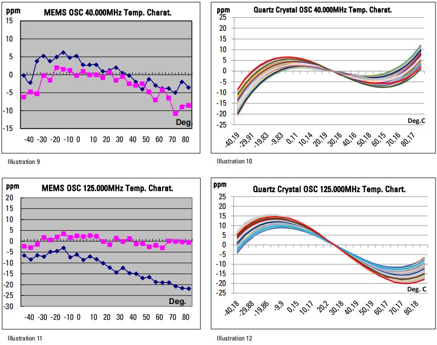 測量了40MHz頻率和125MHz頻率的MEMS振蕩器和晶體振蕩器的頻率溫度特性,首先達到穩定的低溫,然后以+2.0°C/分鐘的速率提高到+85°C的溫度。測試結果如下圖9-12所示。