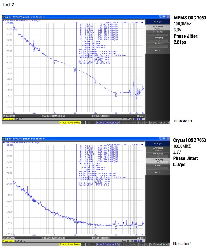 測試結果:三種被測試的晶體振蕩器都比三種MEMS振蕩器有更好的抖動