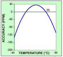某些RTC(如DS1340)提供數字校準寄存器,可用于定期調整離散量的時間.該方法根本不試圖改變晶體行為,而是根據在指定溫度下的預期頻率偏差周期性地調整時間.其效果是將32.768kHz拋物線曲線向上或向下移動到所需溫度下接近0.0ppm的精度.這是通過在石英晶體振蕩器分頻器鏈中加上或減去時鐘周期來實現的.去除的時鐘脈沖數(減去負校準)或插入(添加用于正校準)由校準寄存器中的值設置.通過添加時鐘脈沖,時間加快(晶體曲線向上移動);通過減去時鐘脈沖,時間減慢(晶體曲線向下移動).圖2顯示了典型的晶體曲線如何向上移動,直到精度接近0.0ppm.在此示例中,測量的溫度為+55°C.