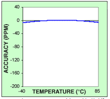 另一個極大提高計時精度的選擇是使用32.768KHZ溫度補償晶體振蕩器(TCXO),如DS32kHz,作為獨立RTC的時鐘源.這些器件經過工廠校準,在工業溫度范圍(-40°C至+85°C)內可提供±7.5ppm的精度.TCXO晶振的作用是使晶體曲線的拋物線性質隨溫度變平(圖3).