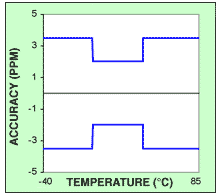 帶有校準寄存器的RTC可以與溫度傳感器組合,在一個特定溫度下達到-2.034ppm至+4.068ppm的精度水平.總調節范圍為-126ppm至+63ppm,因此,在極高和極低溫度下,曲線無法調節到足以達到0.0ppm.需要處理器開銷來定期測量溫度,計算新的校準寄存器值,并調整適當的RTC寄存器.該方法的主要困難是所需的工廠校準工作.由于每個晶振的行為都不同,因此每個計時裝置都需要一個適合所需溫度范圍的定制校準表.這種努力所需的人力和時間可能變得很麻煩.存儲校準數據也需要一定量的非易失性存儲器,這增加了總成本.此外,補償值不能補償不可避免的晶體老化,僅在第一年就可以接近±3ppm.雖然校準寄存器方法在溫度變化時不提供自動調整,但它仍然提供了精度的漸進改進.