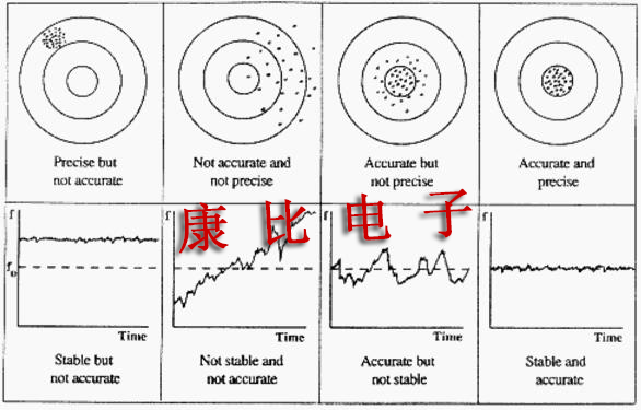 振蕩器表現(xiàn)出各種不穩(wěn)定性.這些包括老化,噪聲和頻率隨溫度,加速度,電離輻射,電源電壓等的變化.術(shù)語精度,穩(wěn)定性和精度通常用于描述振蕩器的不穩(wěn)定性質(zhì)量.圖1說明了射手和頻率源的這些術(shù)語的含義.(對于神射手,每個彈孔與目標(biāo)中心的距離是"測量".)