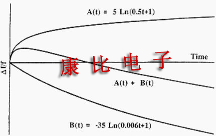 老齡化可能是積極的還是消極的[17].偶爾會觀察到老化方向的逆轉(zhuǎn).在恒定溫度下,老化通常具有與時間近似的對數(shù)依賴性.典型的(計算機模擬的)老化行為如圖16所示,其中A(t)是對數(shù)函數(shù),B(t)是相同的函數(shù)但具有不同的系數(shù).顯示反轉(zhuǎn)的曲線是其他兩條曲線的總和.逆轉(zhuǎn)表明存在至少兩種老化機制.振蕩器的老化率在首次打開時最高.當(dāng)晶體單元的溫度改變時(例如,當(dāng)OCXO關(guān)閉并且稍后打開時),開始新的老化循環(huán).(有關(guān)溫度循環(huán)影響的其他討論,請參閱下面有關(guān)滯后和回掃的部分.)