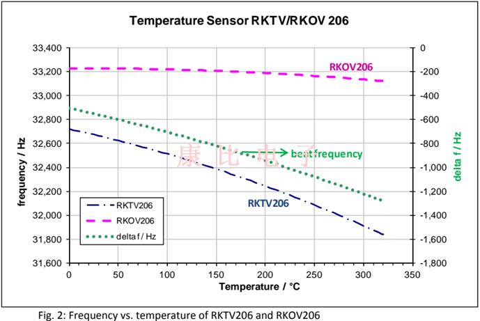 溫度傳感器晶體RKTV206顯示諧振頻率對溫度T的單調響應,如圖2所示(藍色點劃線).