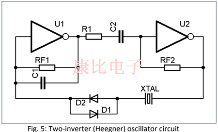 該電路基本上由兩個串聯的邏輯反相器門組成,晶體插入第二反相器的輸出和第一反相器的輸入之間.這個電路允許用比皮爾斯振蕩器稍長的引線連接晶體.