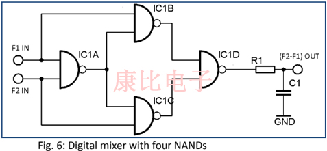如圖6所示,混合可以通過使用四路NANDIC的數字混頻器來實現. 示意圖中所示的R1-C1低通僅是象征性的,可能無法提供足夠的過濾.或者,混合可以通過微控制器中的軟件直接執行.