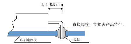 產(chǎn)品的玻璃部分直接彎曲引腳或用力拉伸引腳會(huì)導(dǎo)致在引腳根部發(fā)生密封玻璃分裂(開(kāi)裂),也可能導(dǎo)致氣密性和產(chǎn)品特性受到破壞.當(dāng)晶體產(chǎn)品的引腳需彎曲成下圖所示形狀時(shí),應(yīng)在這種場(chǎng)景下留出0.5mm的引腳并將其托住,以免發(fā)生分裂.當(dāng)該引腳需修復(fù)時(shí),請(qǐng)勿拉伸,托住彎曲部分進(jìn)行修正.在該密封部分上施加一定壓力,會(huì)導(dǎo)致氣密性受到損壞.所以在此處請(qǐng)不要施加壓力.另外,為避負(fù)機(jī)器共振造成引腳疲勞切斷,建議用粘著劑將產(chǎn)品固在定電路板上.