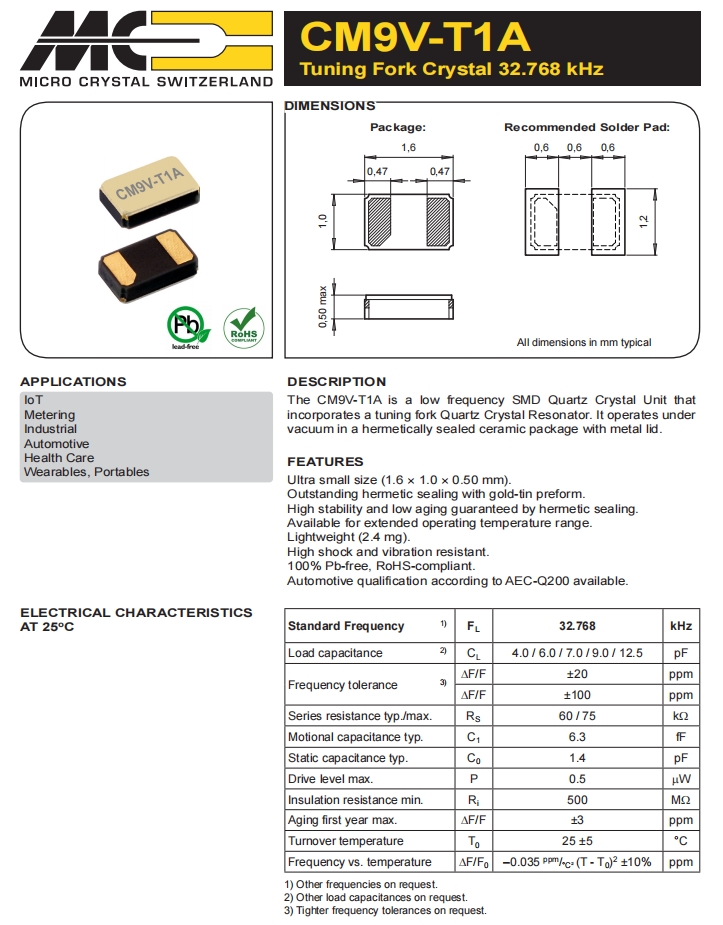 6G物聯(lián)網(wǎng)晶振,Micro微晶音叉晶體,CM9V-T1A-32.768kHz-12.5pF-20PPM-TA-QC,尺寸1610mm,頻率為32.768KHZ,MicroCrystal,瑞士進(jìn)口晶振,進(jìn)口貼片晶振,SMD晶振,石英晶振,兩腳貼片晶振,無源貼片晶振,水晶振動(dòng)子,1610mm貼片晶振,石英貼片晶振,SMD晶體諧振器,石英晶體諧振器,32.768K音叉晶振,無鉛環(huán)保晶振,可穿戴設(shè)備晶振,醫(yī)療保健晶振,便攜式設(shè)備晶振,計(jì)時(shí)器晶振,32.768KHZ無源晶體,輕薄型晶振,工業(yè)應(yīng)用晶振,汽車應(yīng)用晶振,醫(yī)療保健專用晶振,高性能晶振,高精度晶振,低功耗晶振,低損耗晶振。