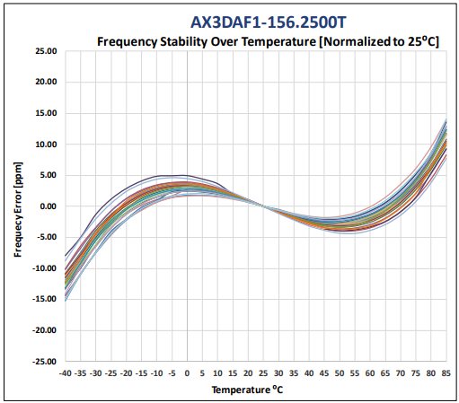 圖4:AX3在-20℃至+70℃時的穩(wěn)定性為15ppm,在-40℃至+85℃時的穩(wěn)定性為25ppm