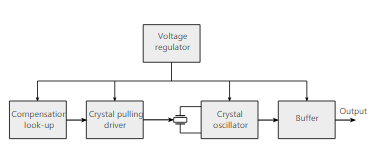 TCXO調(diào)節(jié)振蕩器的頻率以補償由于溫度變化而發(fā)生的變化.為實現(xiàn)這一目標(biāo),TCXO中的主要元件是壓控振蕩器(VCXO).它連接到一個檢測溫度的電路,并向振蕩器施加一個小的校正電壓,如下所示.