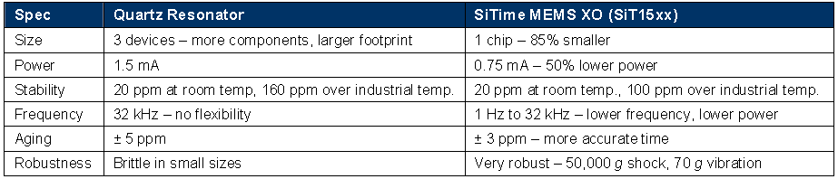 表1:石英晶體振蕩器與SiT15xx微機(jī)電系統(tǒng)振蕩器的匯總比較